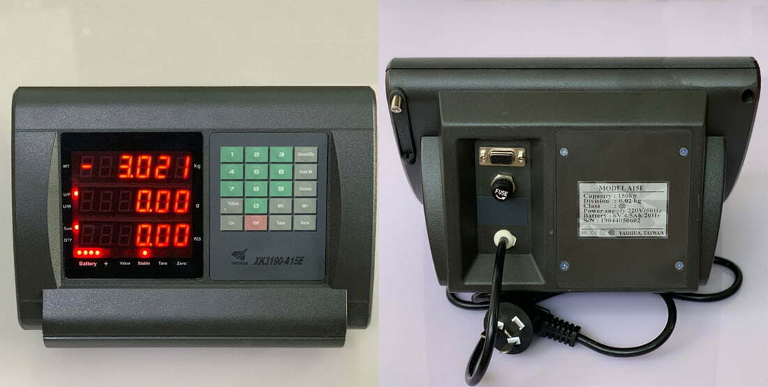– Cân sàn điện tử A15E . Là một mẫu cân sàn tiêu chuẩn có chức năng đo lường và tính toán. Bộ chỉ thị A15E gồm ba cửa sổ, nếu chọn cân đếm 3 cửa sổ hiển thị là số đếm,trọng lượng từng mẫu và trọng lượng tổng , Nếu bạn chọn cân tính giá có 3 cửa sổ là khối lượng, đơn giá, thành tiền .
