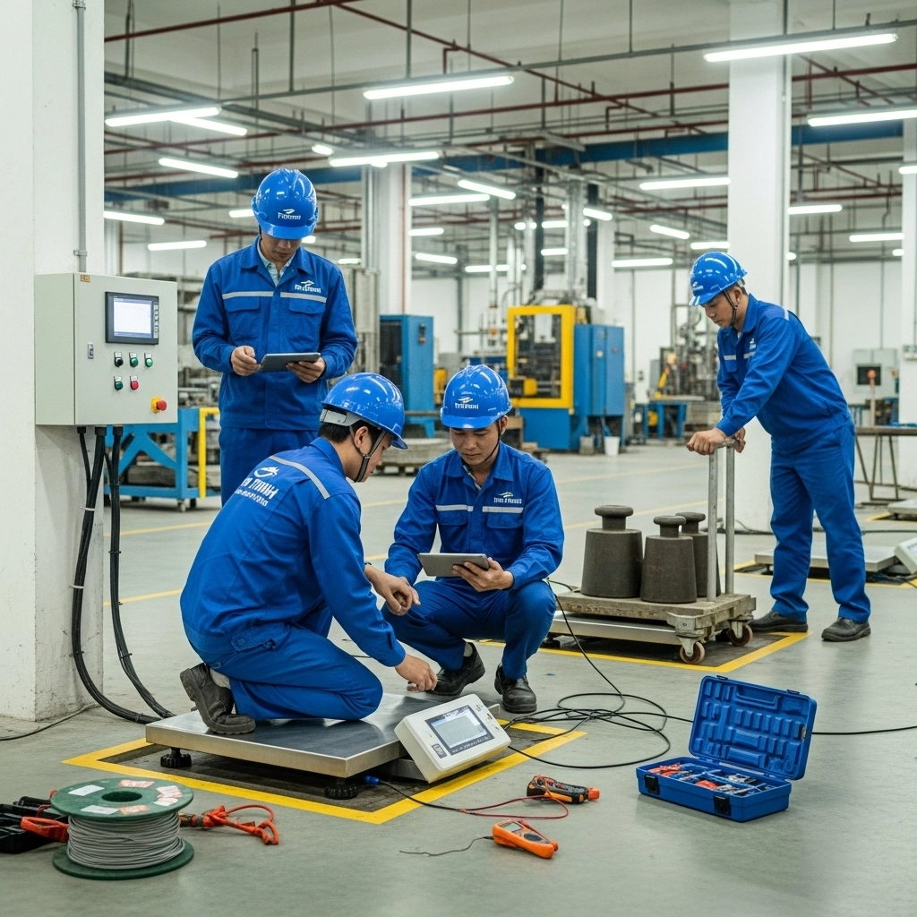 Việc kiểm định nên tiến hành ít nhất 2 lần/năm, tùy theo cường độ sử dụng. Quy trình kiểm định cần tuân theo TCVN 6001:2008 (hoặc các tiêu chuẩn quốc tế tương đương như OIML R76). Kết quả hiệu chuẩn giúp xác định sai số hiện tại, từ đó kỹ thuật viên có thể cân chỉnh lại loadcell hoặc mạch khuếch đại cho chính xác.